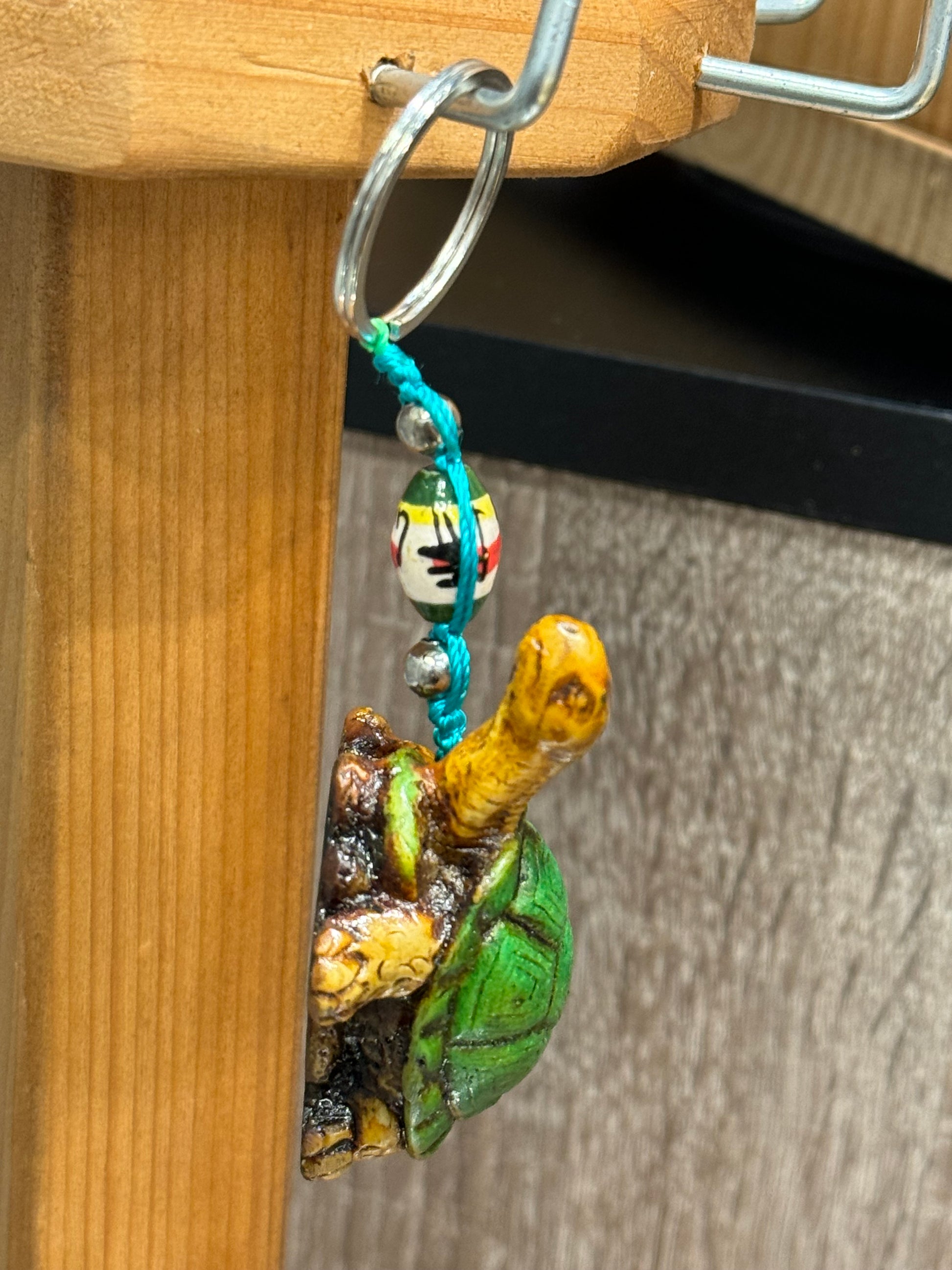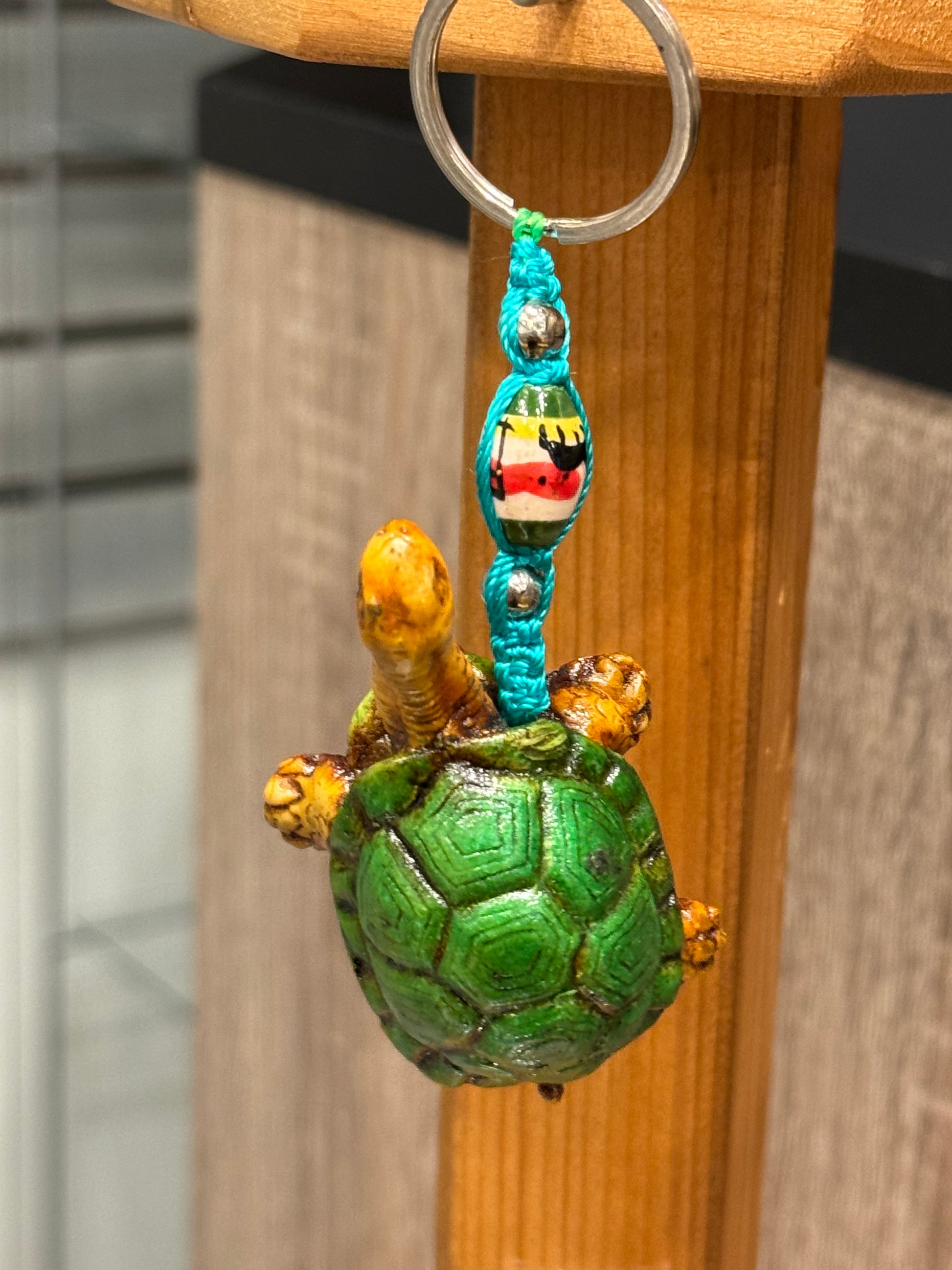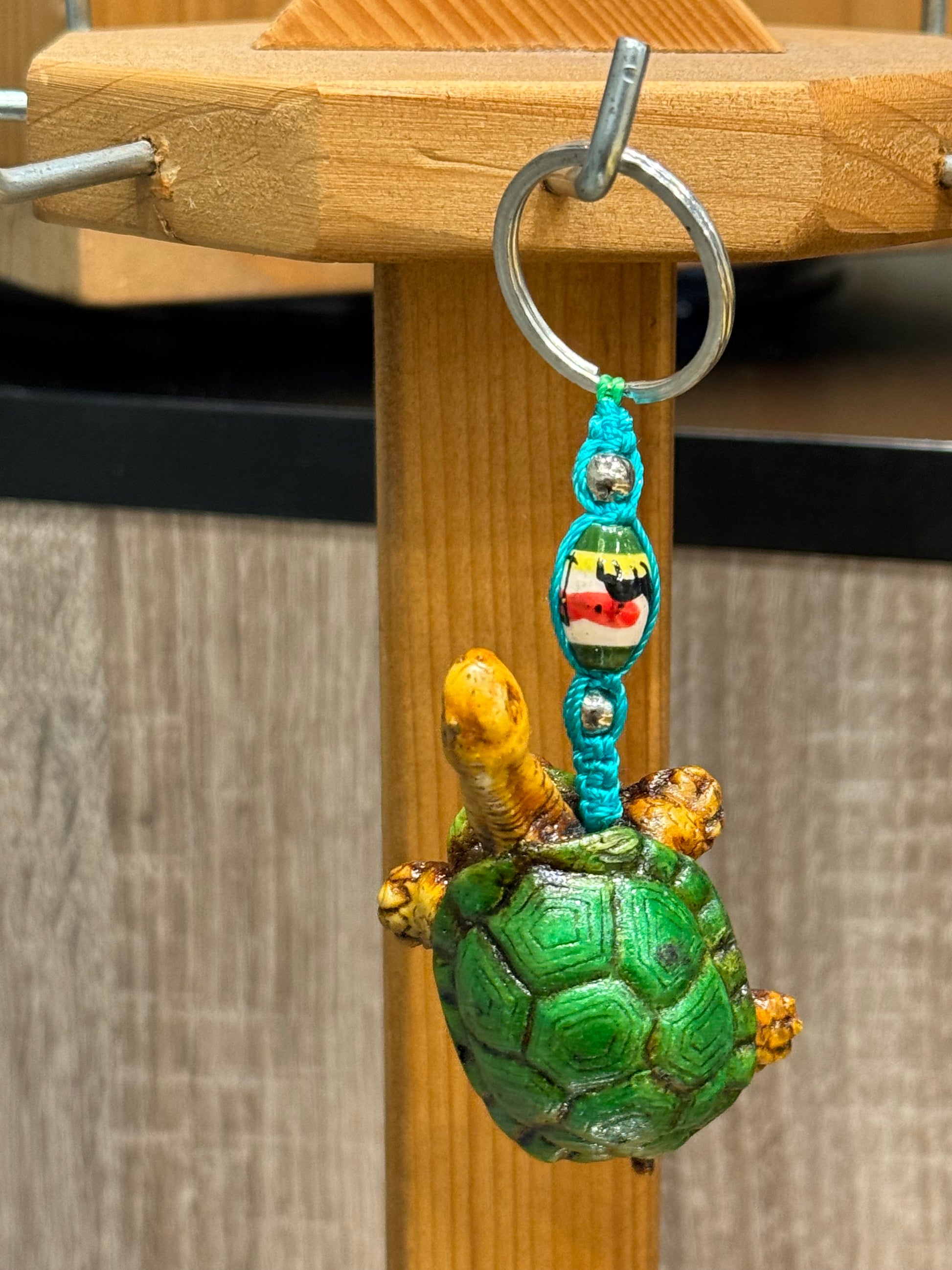 Handcrafted durepox resin figurine keychain of a green and brown land turtle. Braided macramé, large bead, and metal keyring attached. Link keychain to your keys, wallet, backpack, or purse!