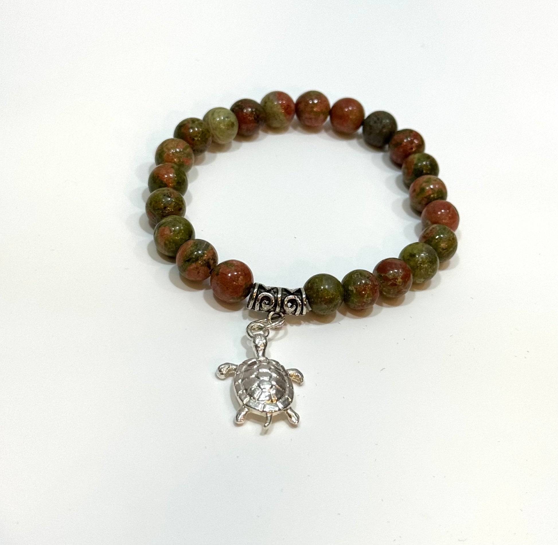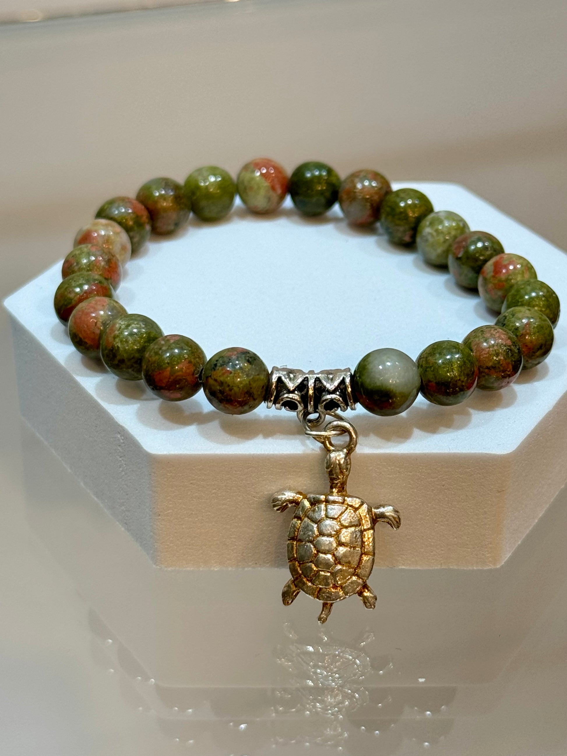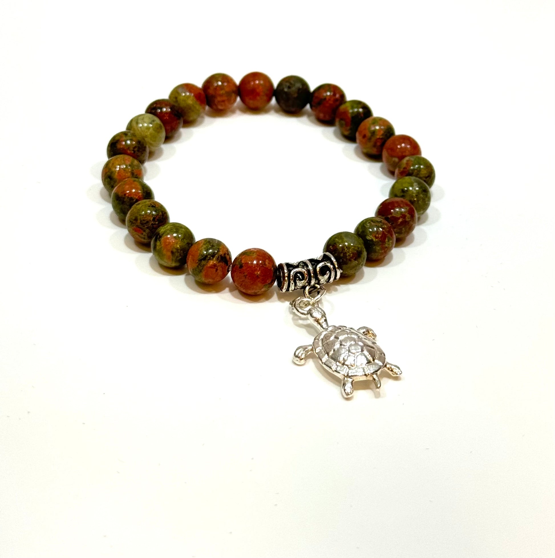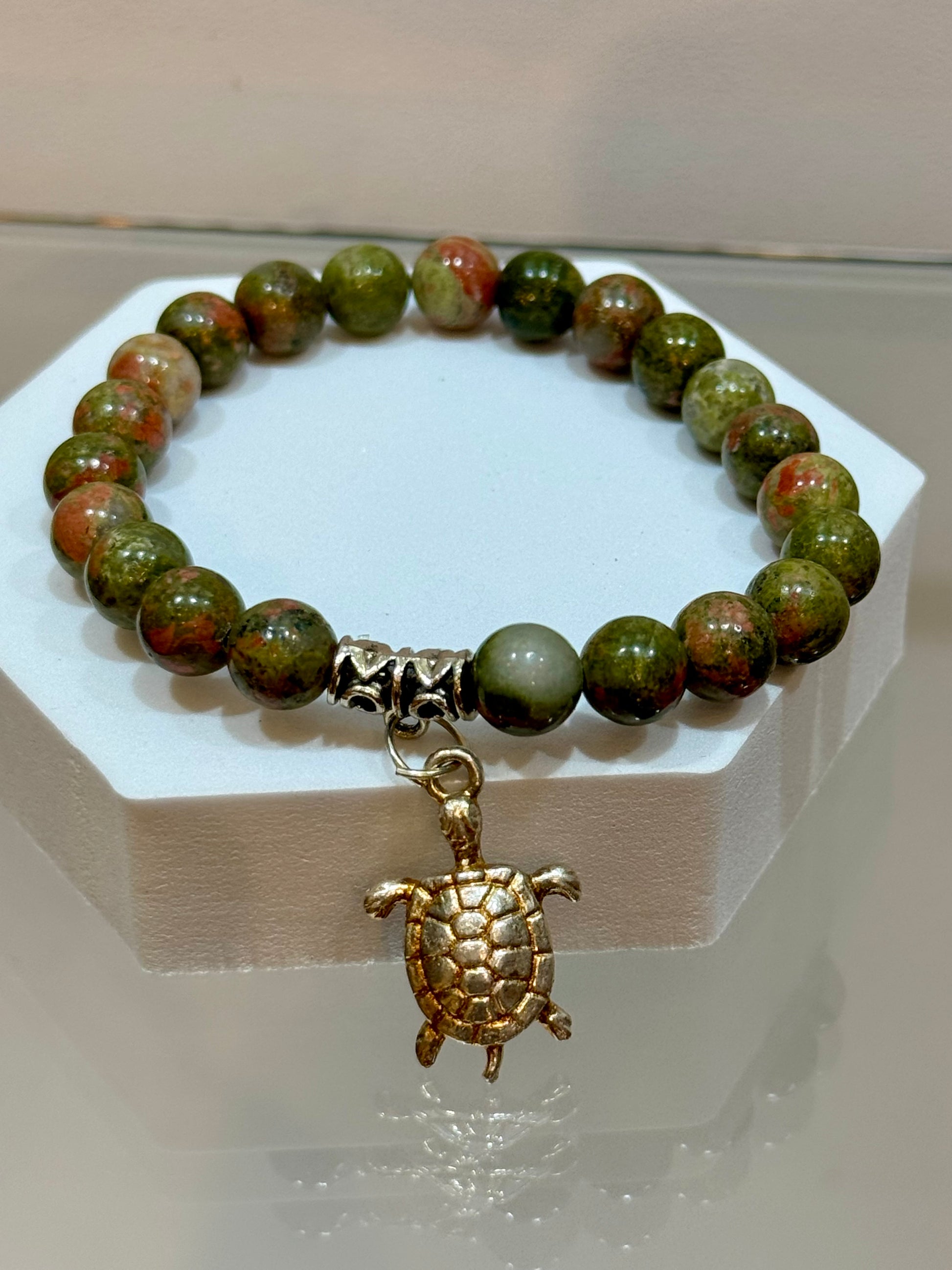 A simple yet powerful bracelet. Unakite helps resolve conflict, loosens constrictions, balancing, aches and pains, self-worth issues, emotional blocks, focus on the present, and great for pregnancy and fertility. 8mm beaded bracelet from China. Unakite Jasper Gem Stone Bracelet with Turtle Charm