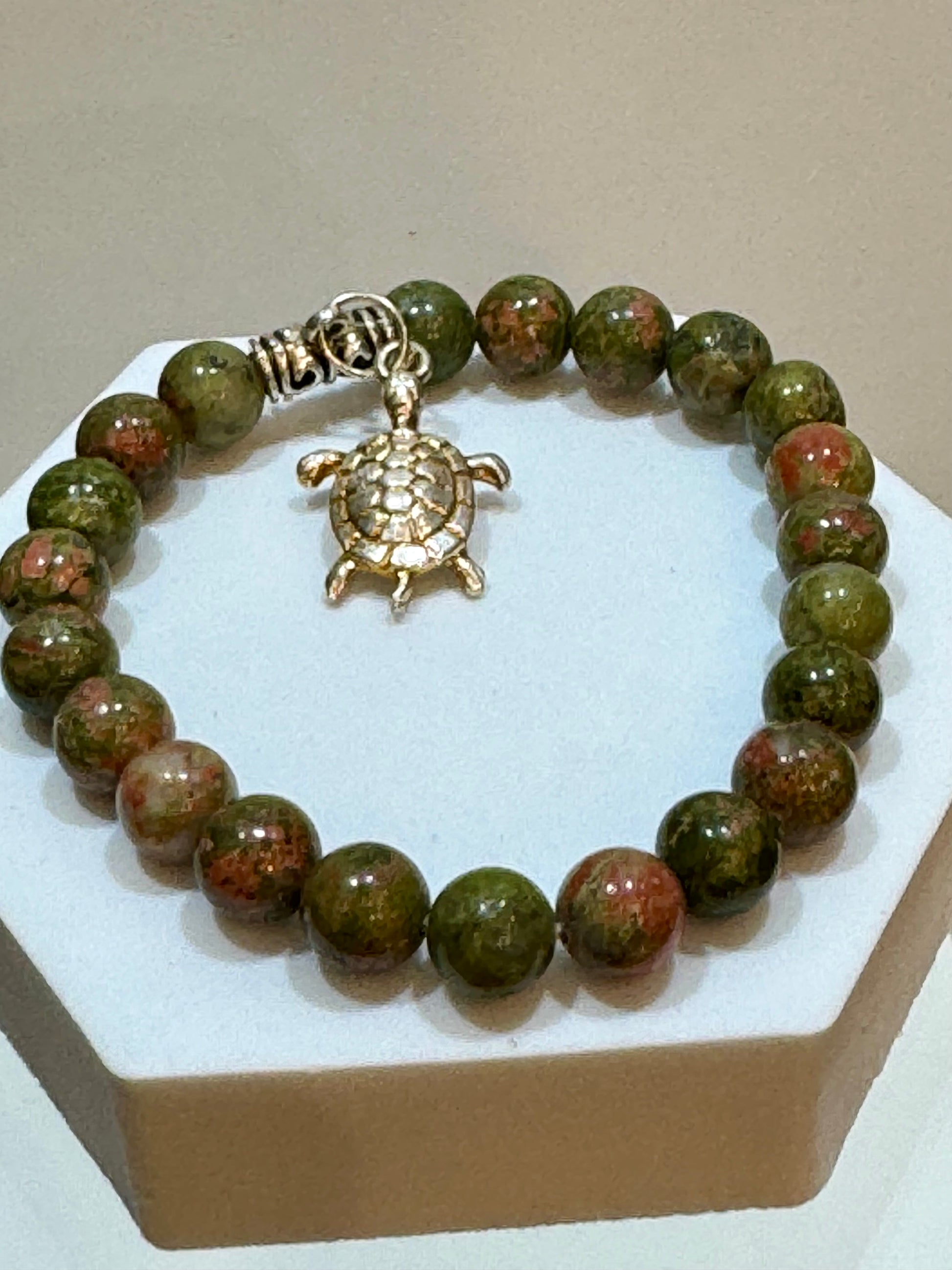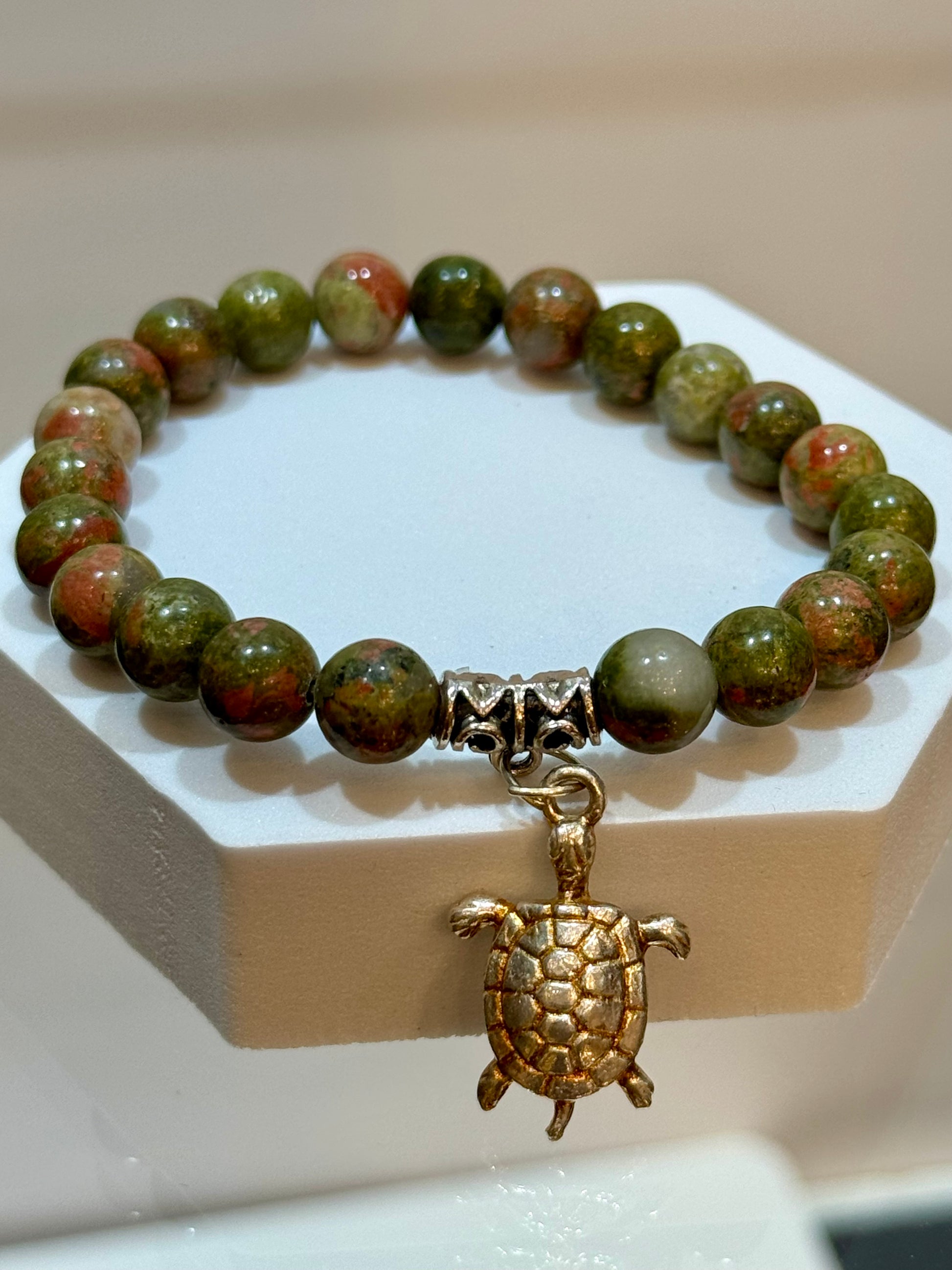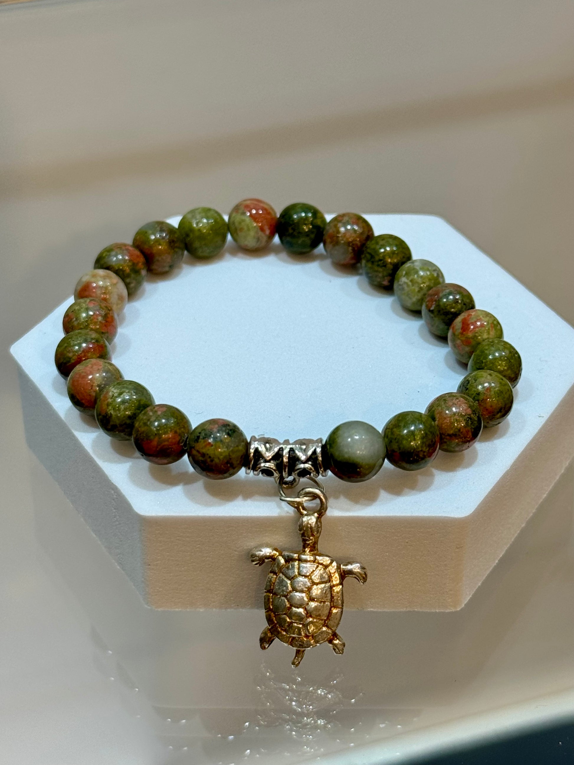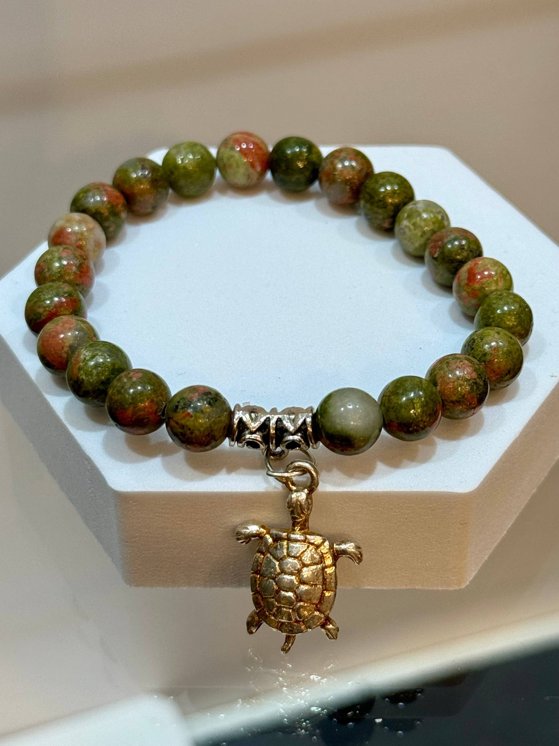 A simple yet powerful bracelet. Unakite helps resolve conflict, loosens constrictions, balancing, aches and pains, self-worth issues, emotional blocks, focus on the present, and great for pregnancy and fertility. 8mm beaded bracelet from China. Unakite Jasper Gem Stone Bracelet with Turtle Charm