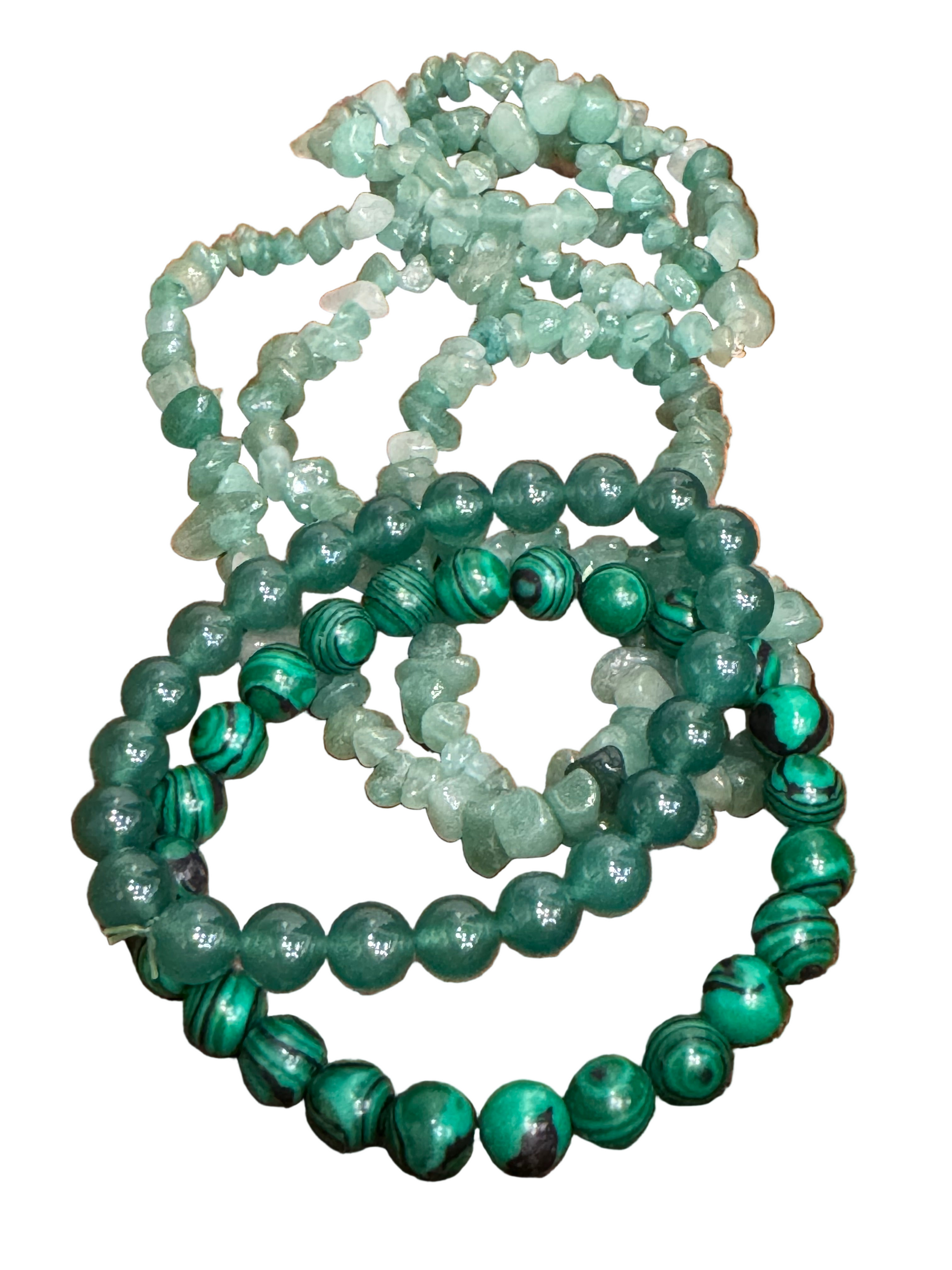 The Wealth & Opportunity Jewelry Stack features bold, rich green stones that symbolize growth and fresh possibilities through their natural appearance. This gemstone jewelry stack includes a Malachite Bracelet, a Green Aventurine Chip Necklace, and Green Agate Bracelet that create a powerful color trio. The Wealth & Opportunity Jewelry Stack is perfect for anyone who loves vibrant, uplifting accessories that stand out in a meaningful way.