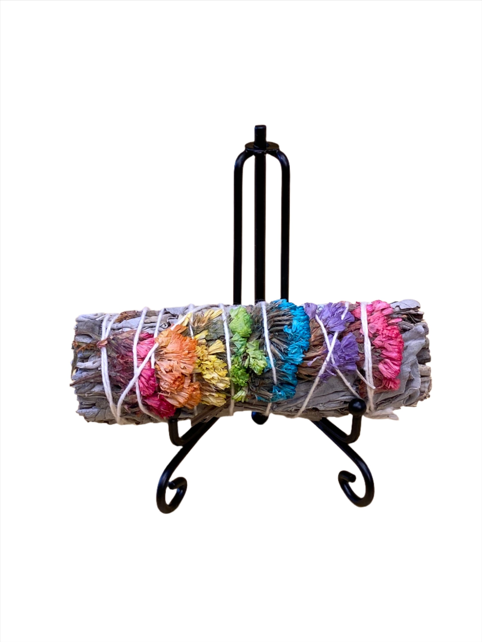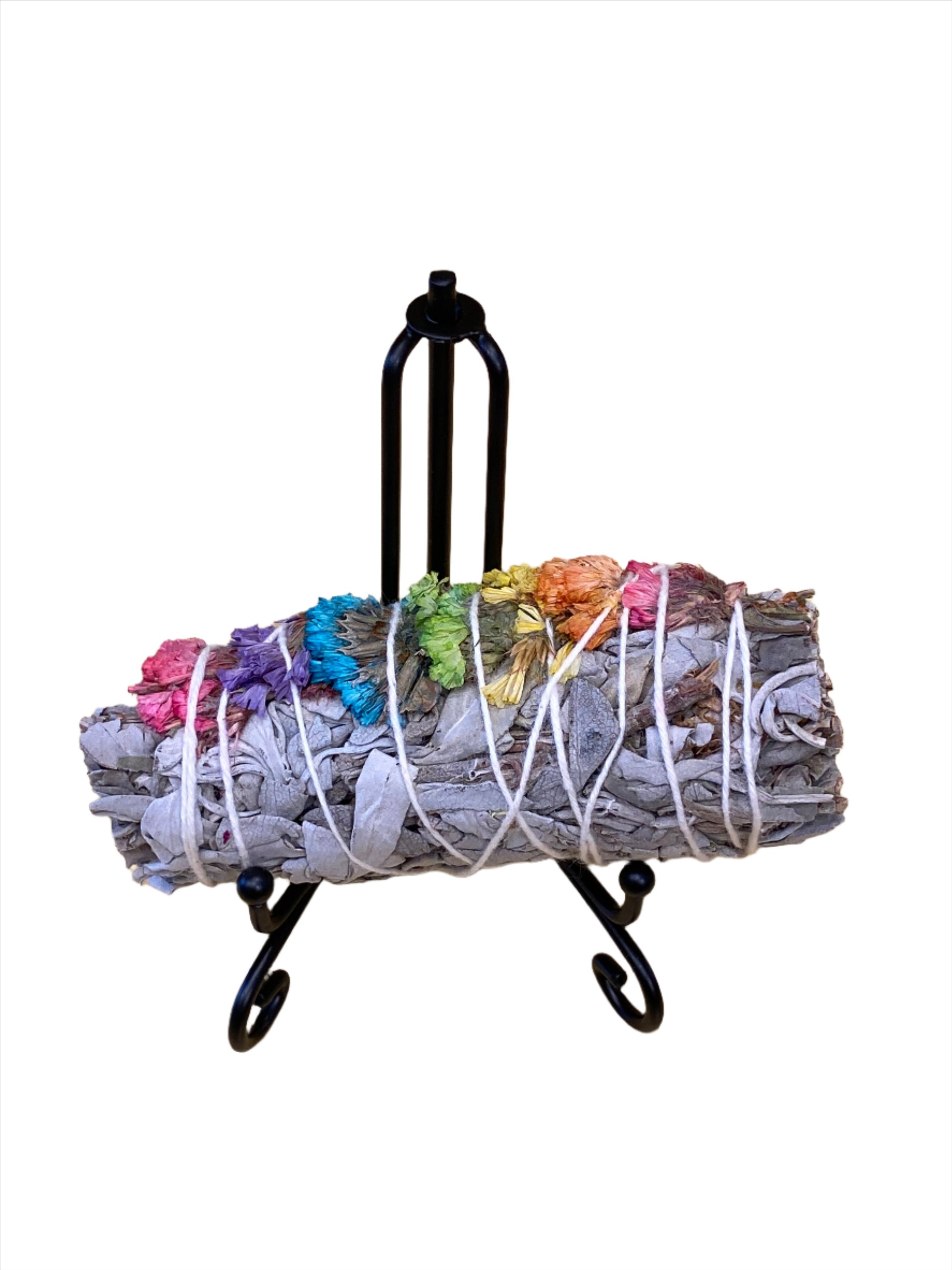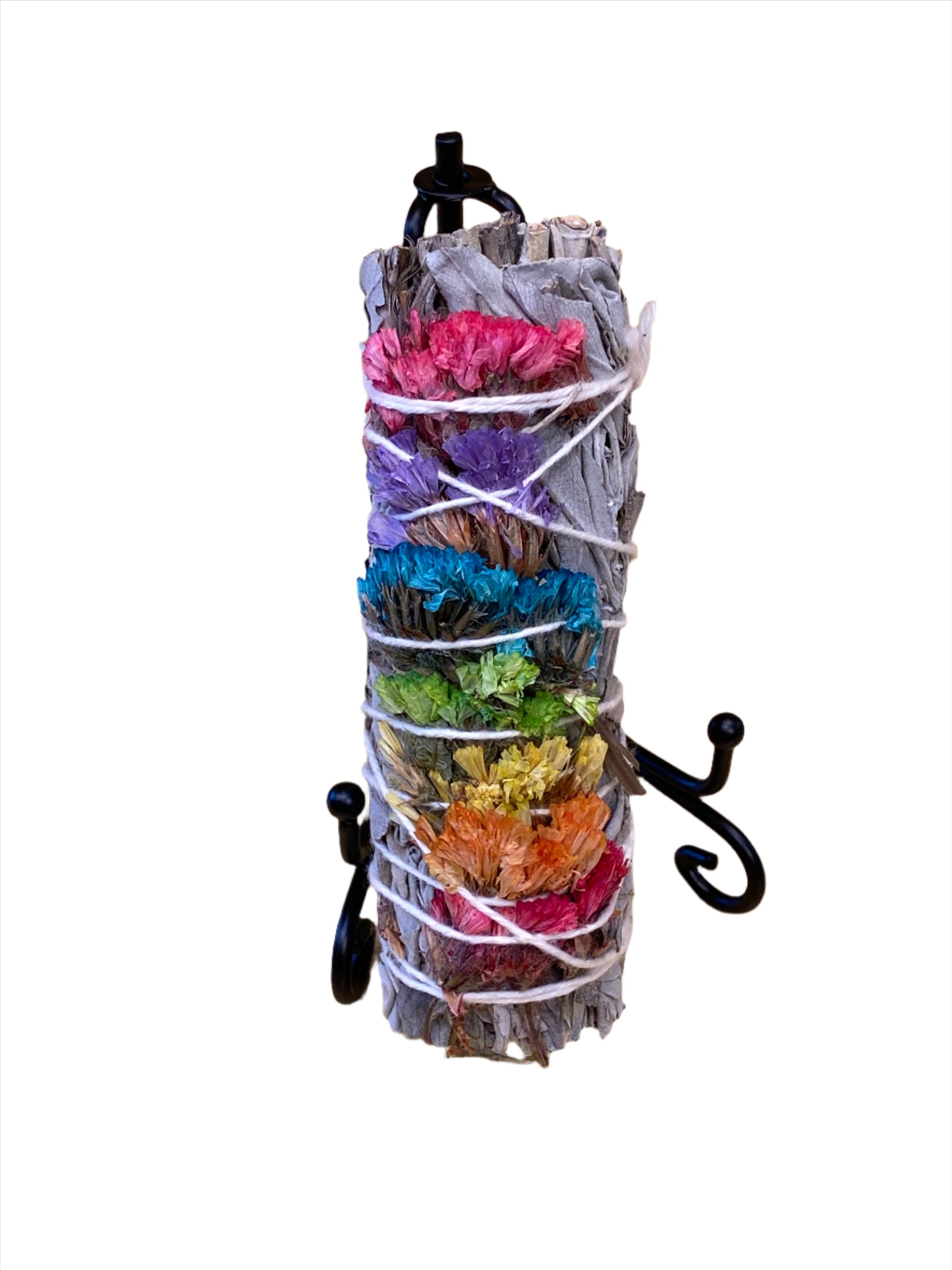 Seven Color Sinuata Flower and White Sage 4" 7 Chakras A colorful smudge stick lined by 7 colors Mullein Flower. Each wand is hand-tied. Gathered from mountains our smudges & herbs are known to purify places, objects, and people. Light our smudges or burn the herbs to purify any surroundings or simply enjoy the wonderful scent of aroma. Light the bundle from the top end or crush the leaves, put them on the burning charcoal tablet & place charcoal burner at safe surface. The real product may looks different because it's a handmade sticks.
