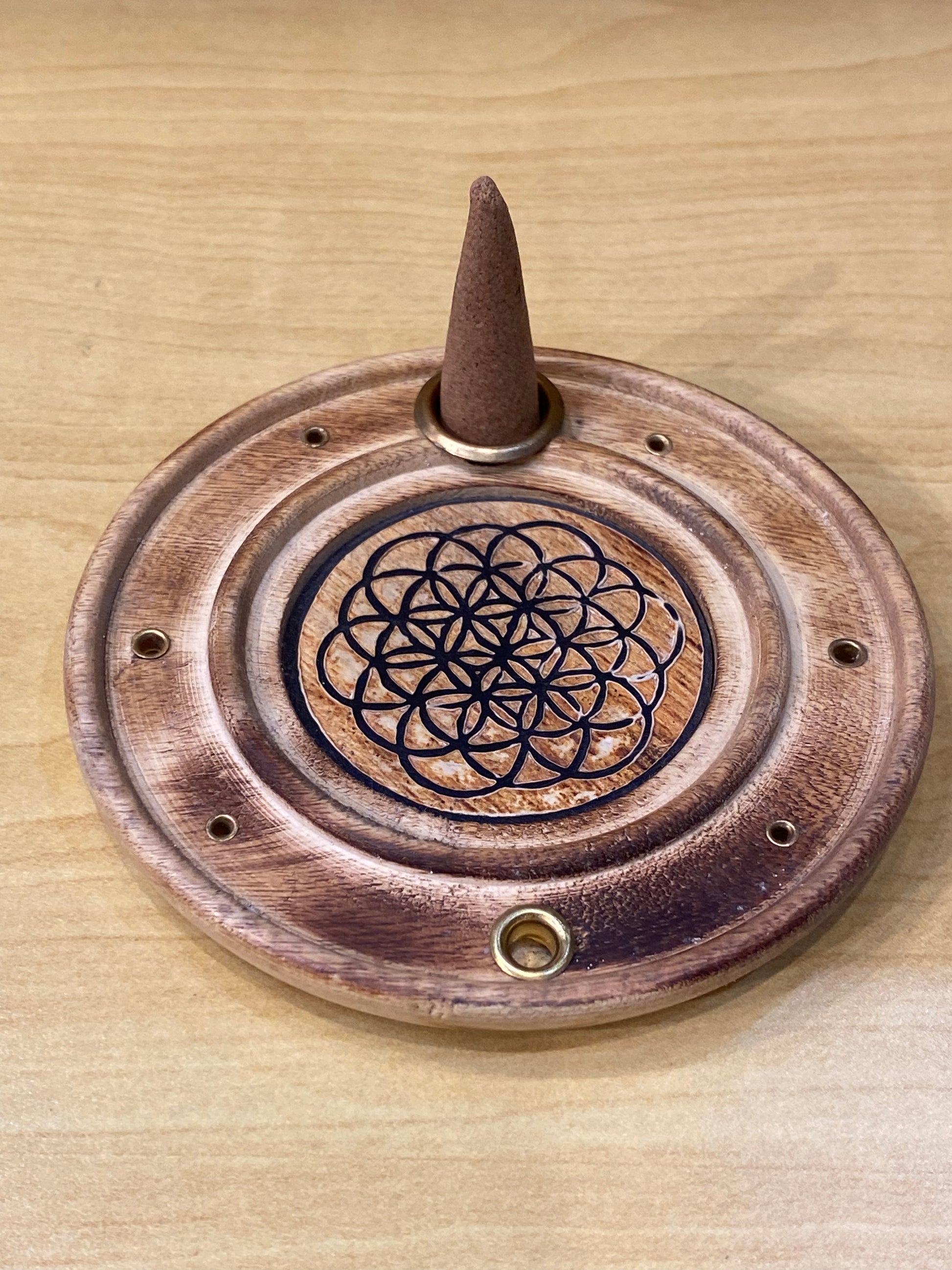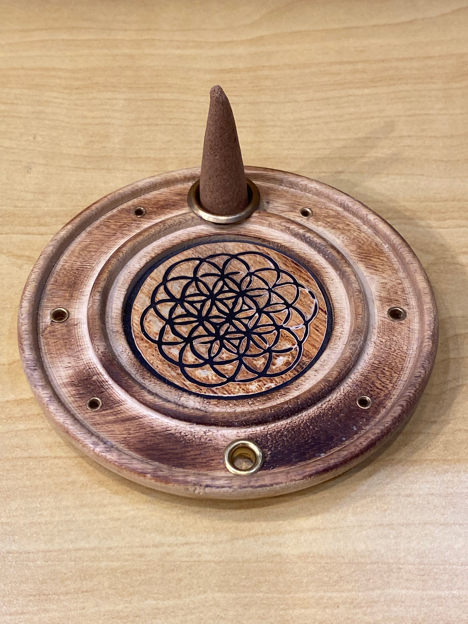 Wood Round Flower Of Life Incense Cone and Stick Burner