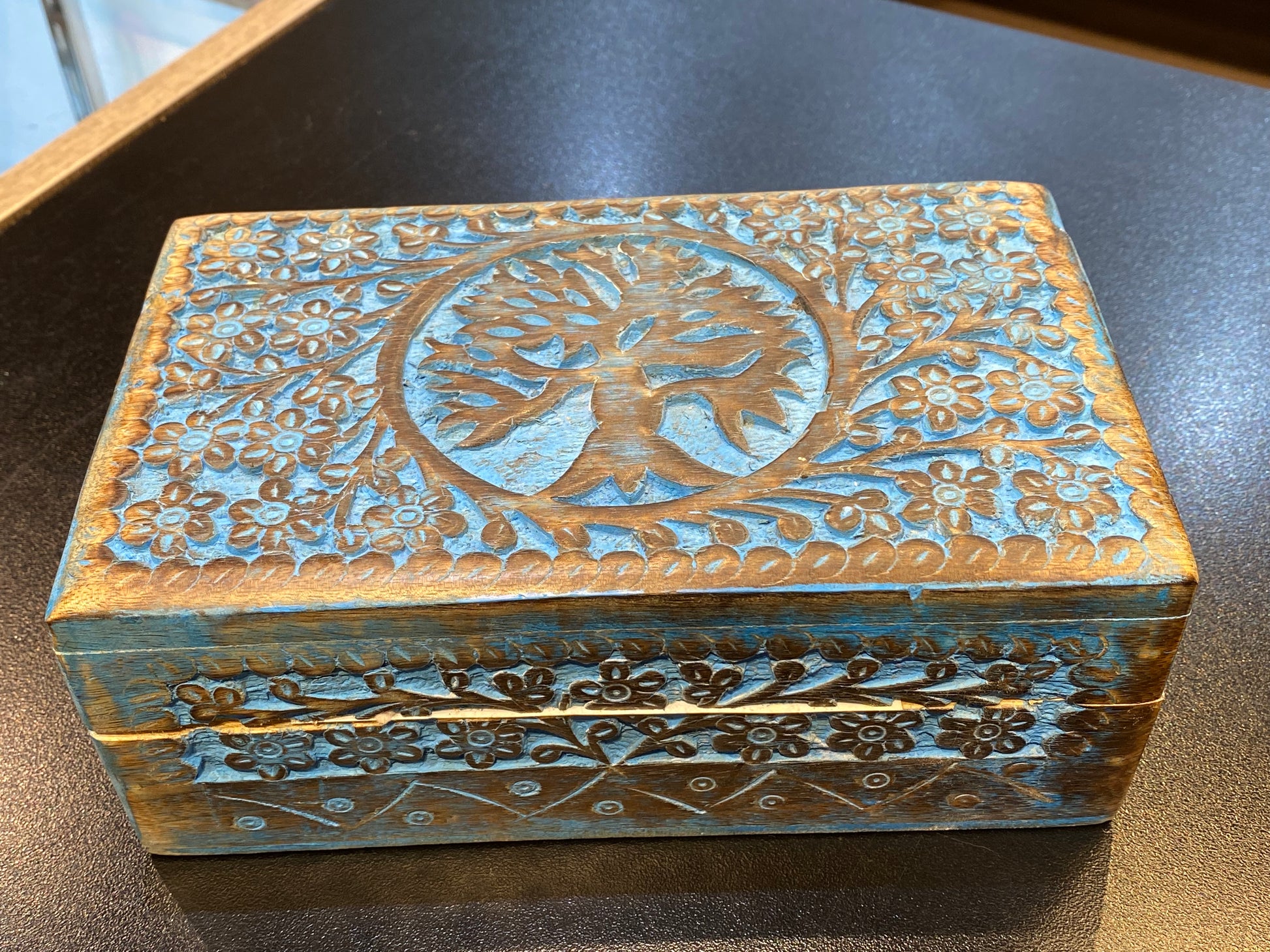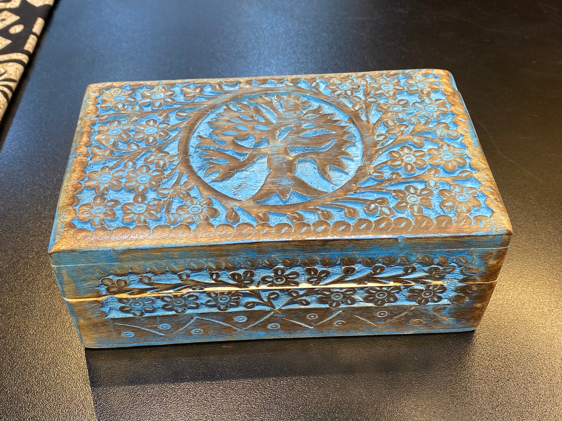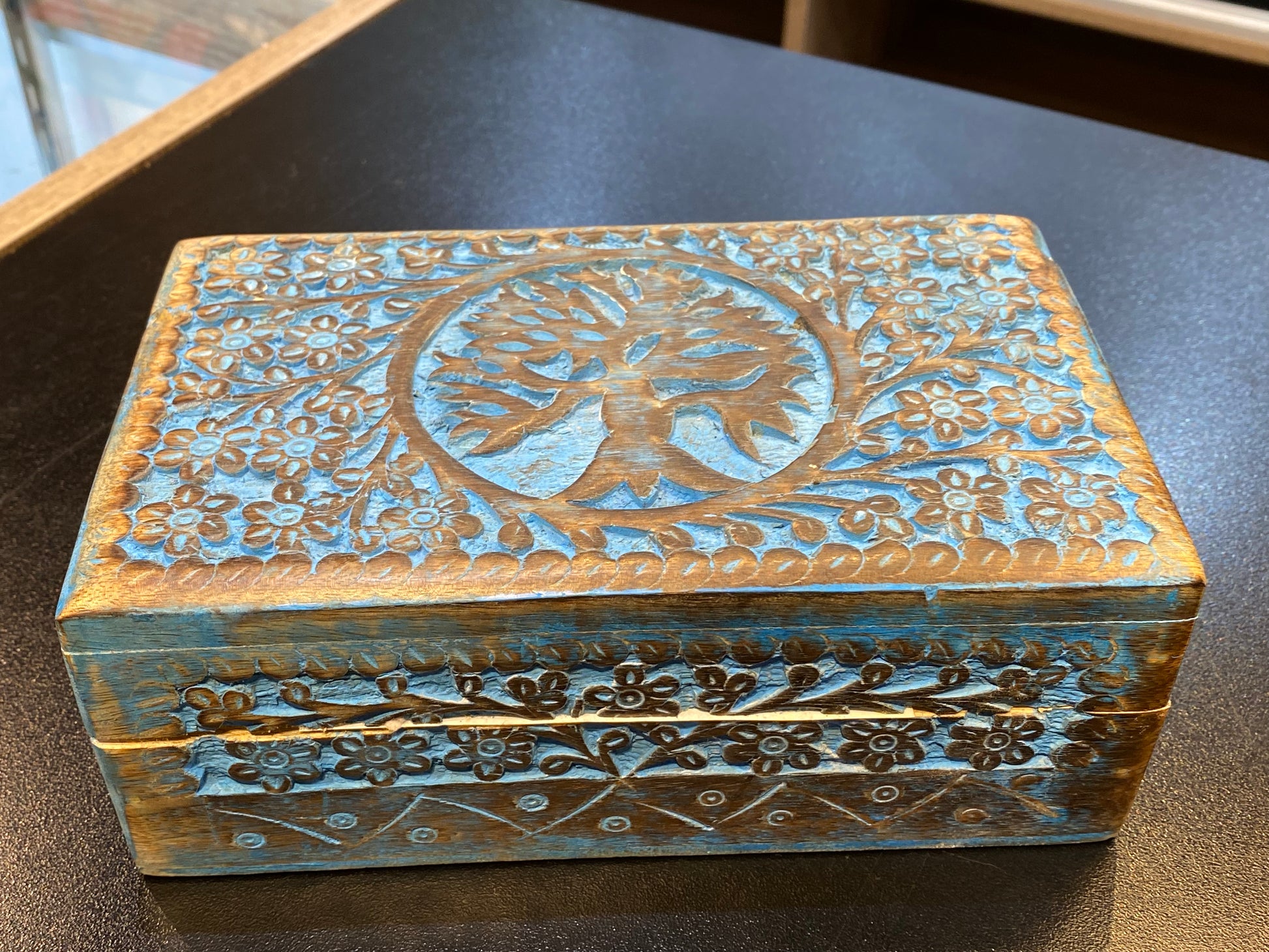 Wooden Handicraft Storage Box 5" x 8" Tree of Life Colored Turquoise